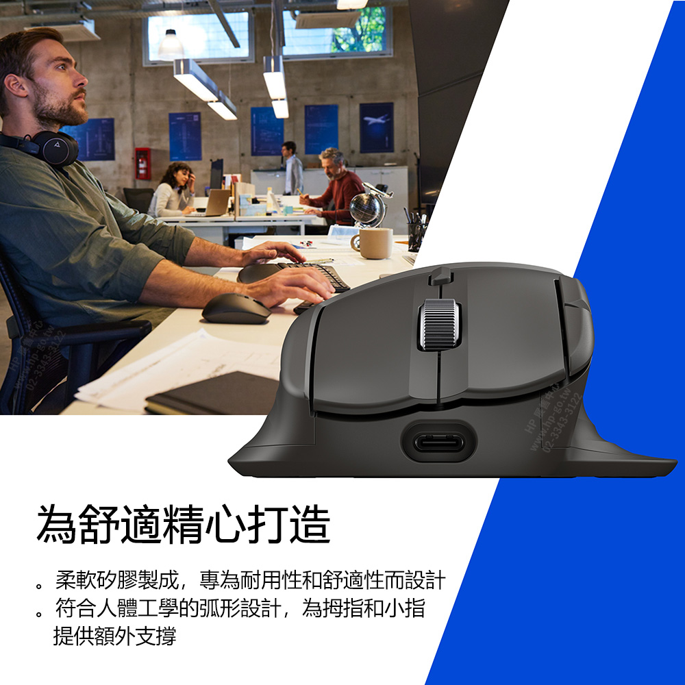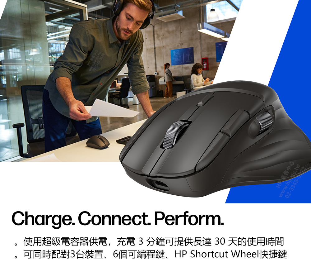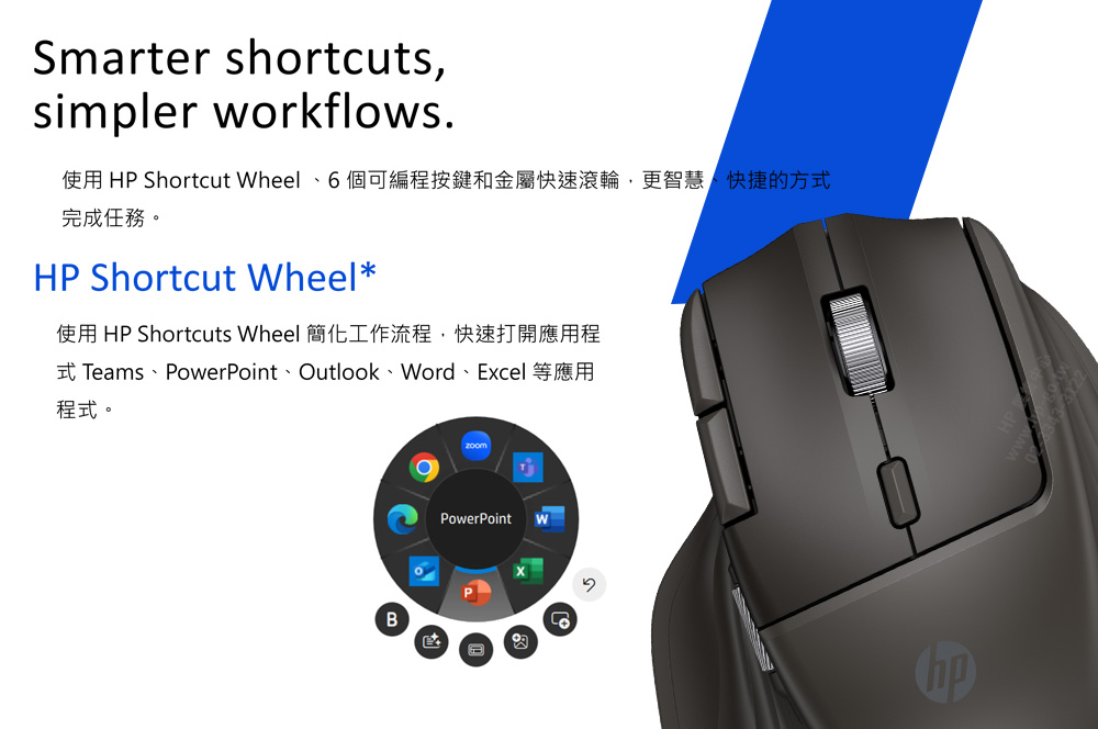 可同時配對3台裝置;4向滾輪;6個可編程鍵;HP Shortcut Wheel快捷鍵 |