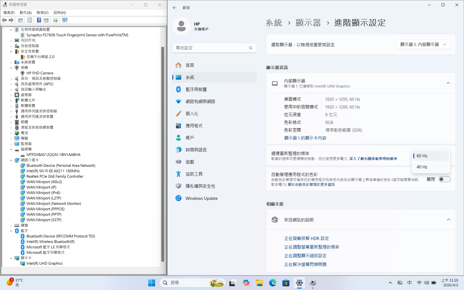 14吋 WUXGA (1920 x 1200) 霧面, WLED, 300nits, Low Power, sRGB 62.5% |
